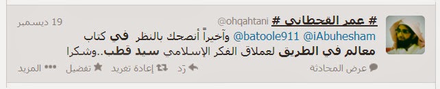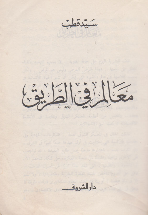 فمن الأمثلة قول سيد قطب في العدالة : بسم الله الرحمن الرحيم كتاب معالم في الطريق هو كتاب من تأليف الإمام الشهيد سيد قطب رحمه الله تعالى رحمة واسعة. هذا التّصوّر وهذا الكلام الذي قاله سيد قطب لا يشكمسلم أنه غاية في السوء ، وأنه ينطبق على من يؤمن به عبارات أكثر. قل لخليلي الذي رجوت به للشاعر ابن نباتة المصري. من أشهر كتب سيد قطب ومن أكثرها جدلاً.